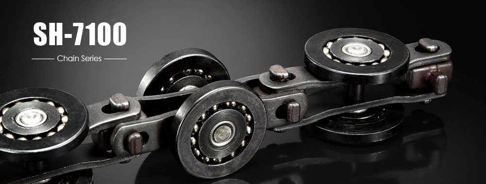 SH-7100:又稱為七噸鏈條,亦是應用較為普遍的懸掛鏈條之一。具有雙水平輪可有效降低水平輪軸承負載,增加水平彎軌道承載能力,其主要零件以中碳鋼為基礎並且經過硬化處理後,有效增加鏈條的抗拉強度,延長鏈條的使用期限。此款鏈條結構簡單設計合理,十字轉向軸為鋼製鍛造一體成型,特殊的無鉚釘接合設計,使鏈板與十字轉軸完美結合而無需使用開口銷,完全無鬆脫掉落的問題。為了增強鏈條載重能力,水平和垂直輪亦採用較高規格設計,同時具備轉向靈活、抗拉伸能力強、載重能力佳等特性。 特別適合在溫度相對較高之環境中使用。 |